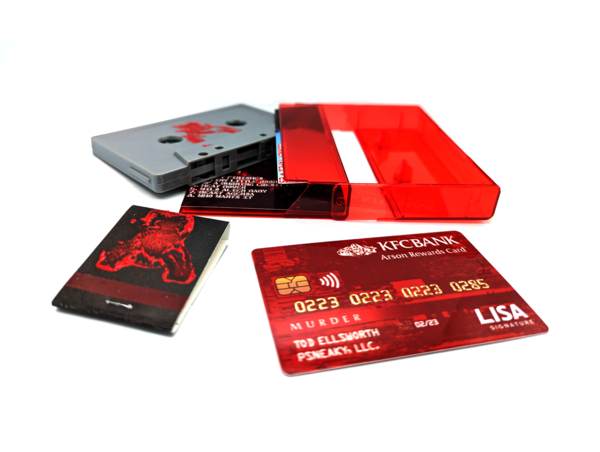 Grey cassette in translucent red cases. Includes KFC Bank Arson Rewards Card (last four digits: 0222 through 0445) + black matchbook with unique Frank seal.