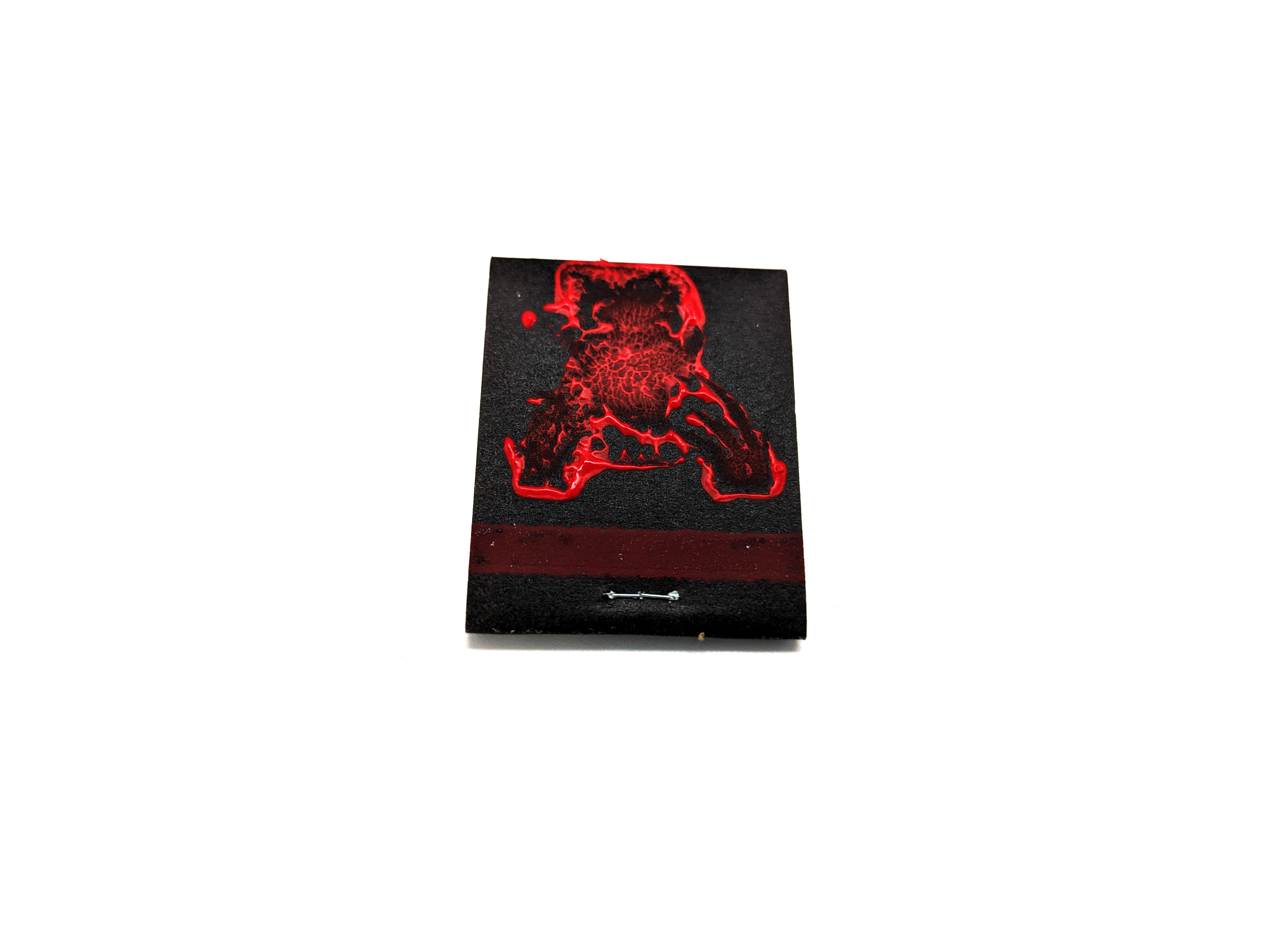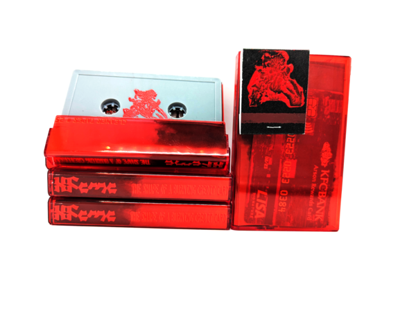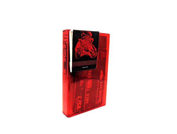 Grey cassette in translucent red cases. Includes KFC Bank Arson Rewards Card (last four digits: 0222 through 0445) + black matchbook with unique Frank seal.