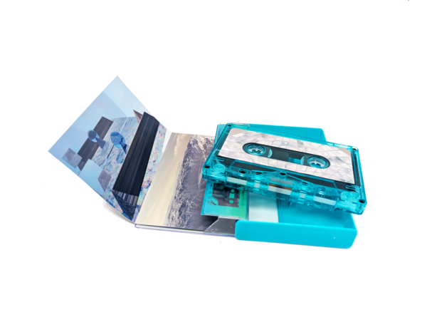 Atmospheric drum & bass. Translucent turquoise C69 cassettes in clear/turquioise cases. Program repeats on both sides. Fold-out insert features visual art by CosineVi.